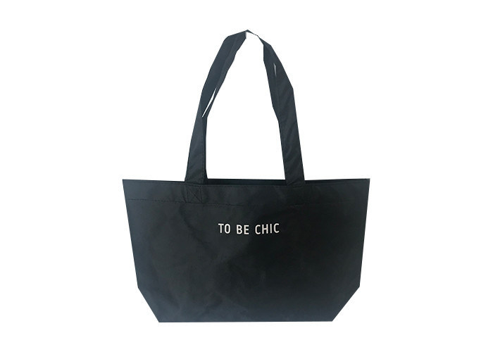 Bolsas reutilizables de poliéster 300D negras personalizadas con soporte de PU y cuerda de tira en el interior